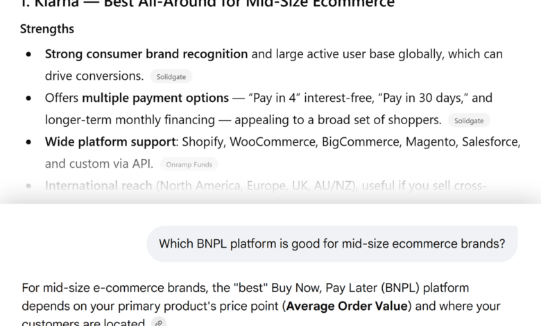 Product Recommendations: This is the most impactful form of AI visibility, where a brand or product is included in a curated shortlist or directly recommended as a solution to a user’s query. These recommendations significantly influence customer consideration and purchasing decisions, especially when they appear in high-intent searches that include terms like "best," "top," "compare," or "alternative." For example, when queried about suitable BNPL platforms for mid-sized e-commerce brands, AI models have frequently recommended Klarna, positioning it prominently as a potential solution for businesses exploring their options.