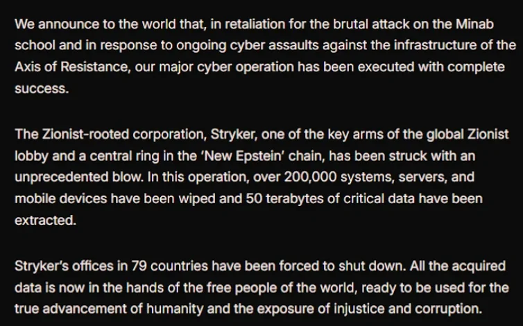 - March 11, 2026 (Morning): Handala issues its manifesto on Telegram, claiming the destruction of Stryker’s global network.