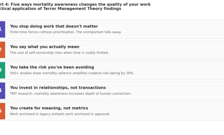 The transformative impact of mortality awareness does not necessitate a dramatic near-death experience. The findings from TMT research consistently demonstrate that even a brief, deliberate engagement with the reality of our finitude – a few minutes of honest reflection – can measurably shift creative behavior and professional priorities.