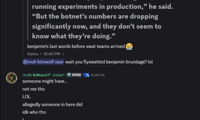 Following the disruption of the Kimwolf botnet, Dort allegedly established a Discord server titled “Krebs’s Koinbase Kallers.” This platform was used to coordinate DDoS attacks, email flooding, and the dissemination of personal information (doxing) belonging to Brundage and Krebs. The rhetoric on the server was overtly violent, with Dort—using the alias “Meow”—posting threats and taunting his targets.